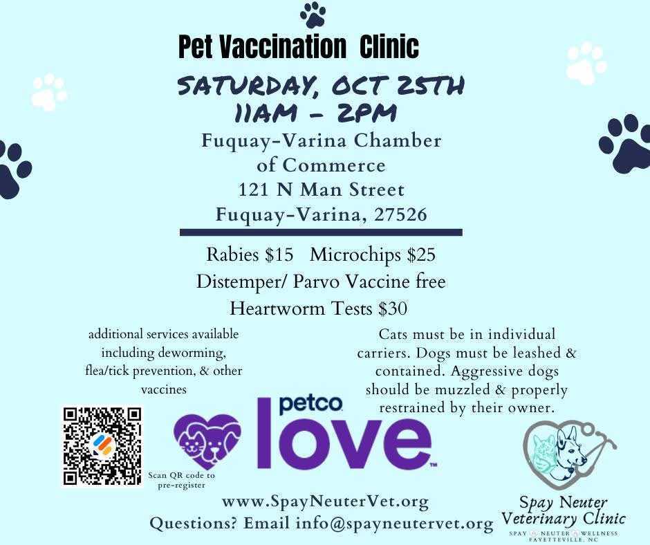 The Spay Neuter Vet Clinic of the Sandhills will host a low-cost vaccination clinic on Saturday, October 25th from 11 AM to 2 PM at the Fuquay-Varina Chamber of Commerce. Services will include vaccines, heartworm testing, microchipping, deworming, and more. Distemper/parvo vaccines will be free, thanks to Petco Love.