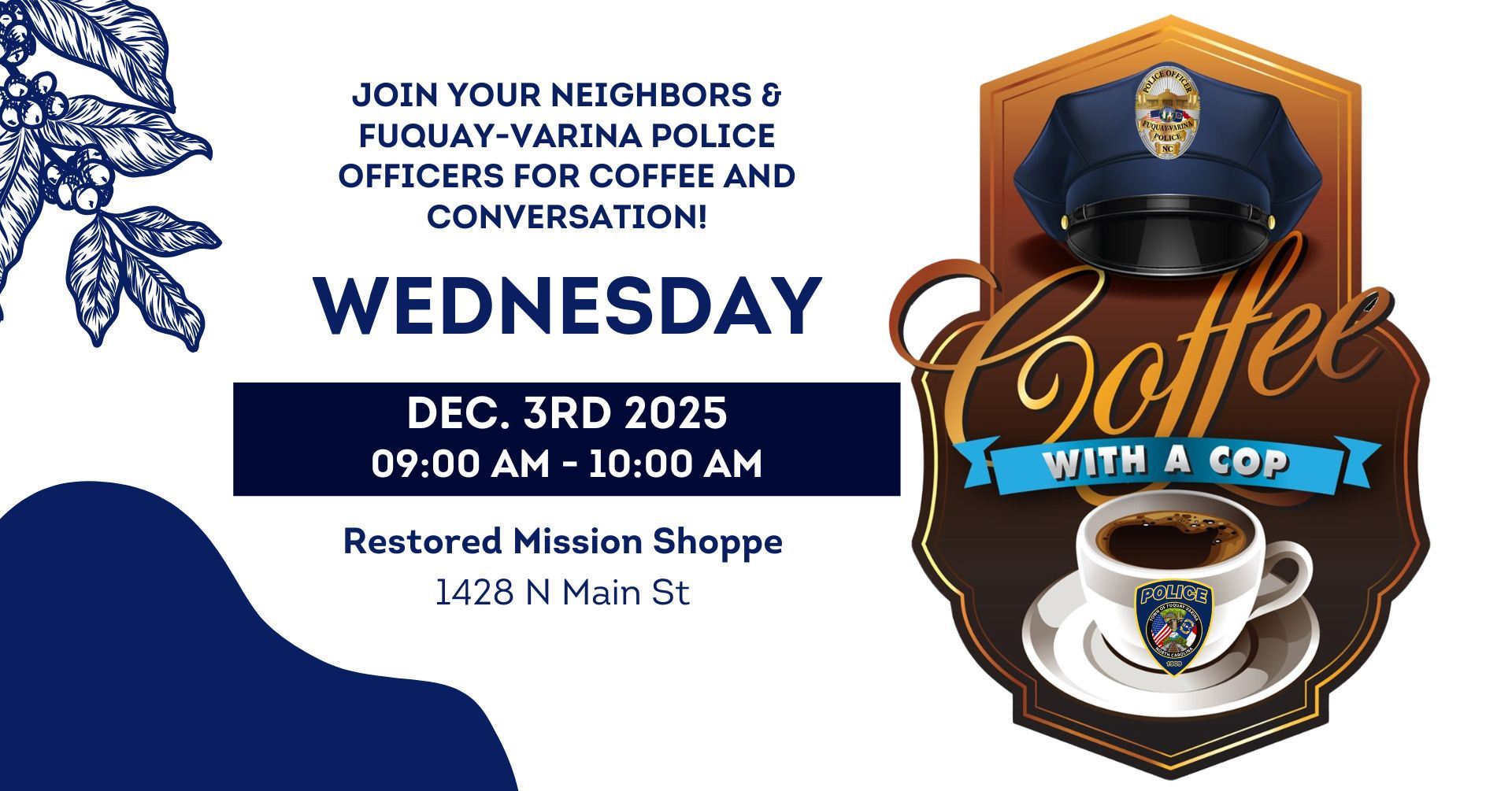 We invite you to join the Fuquay-Varina Police Department for our Coffee with a Cop event! It's a great opportunity to meet your local officers, ask questions, share concerns, or just enjoy a cup of coffee in a relaxed setting.