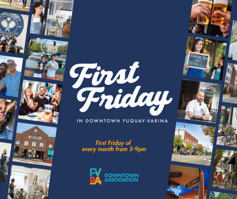 "Join us for First Fridays in Fuquay-Varina every month! From 5-9 pm on the first Friday of each month, enjoy live music, local shopping, and vibrant community activities. Bring friends and family to explore our charming downtown, discover special deals, enjoy delicious food, and experience a lively arts scene.